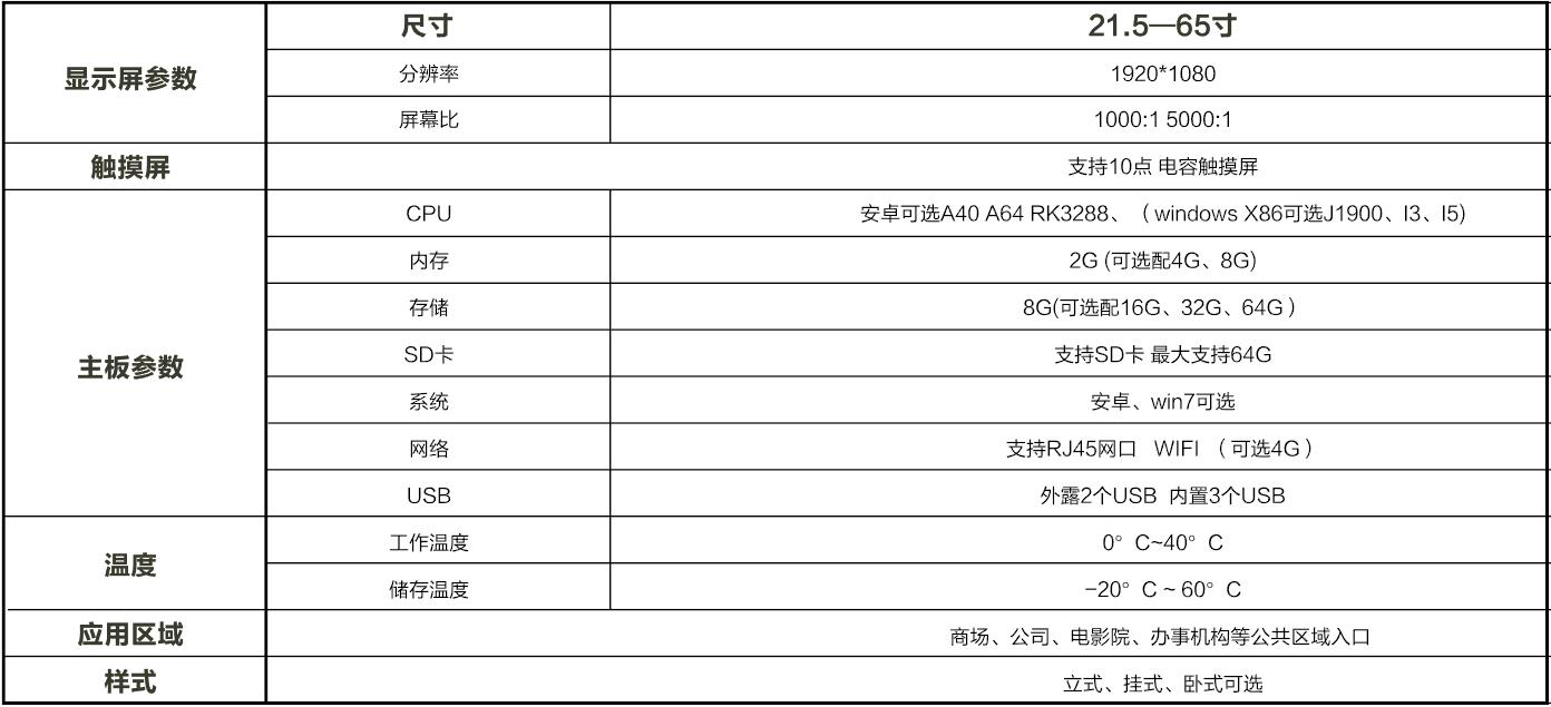 超薄機(jī)身;質(zhì)感拉絲金屬;高清畫(huà)質(zhì);觸摸極速反應(yīng);智能分屏;智能遠(yuǎn)程信息發(fā)布;可定時(shí)開(kāi)關(guān)機(jī);提前設(shè)定節(jié)目源;鋼化玻璃屏幕;可定制專屬LOGO、多種顏色、尺寸可選。